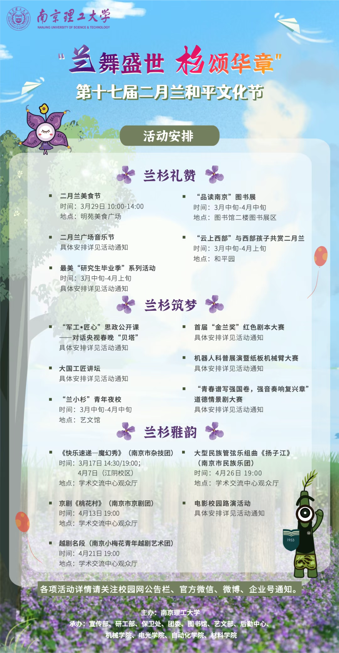 据了解,南京理工大学第十七届二月兰和平文化节也正在进行中,“二月兰美食节”“‘品读南京’图书展”“兰小杉”青年夜校等系列活动精彩来袭。