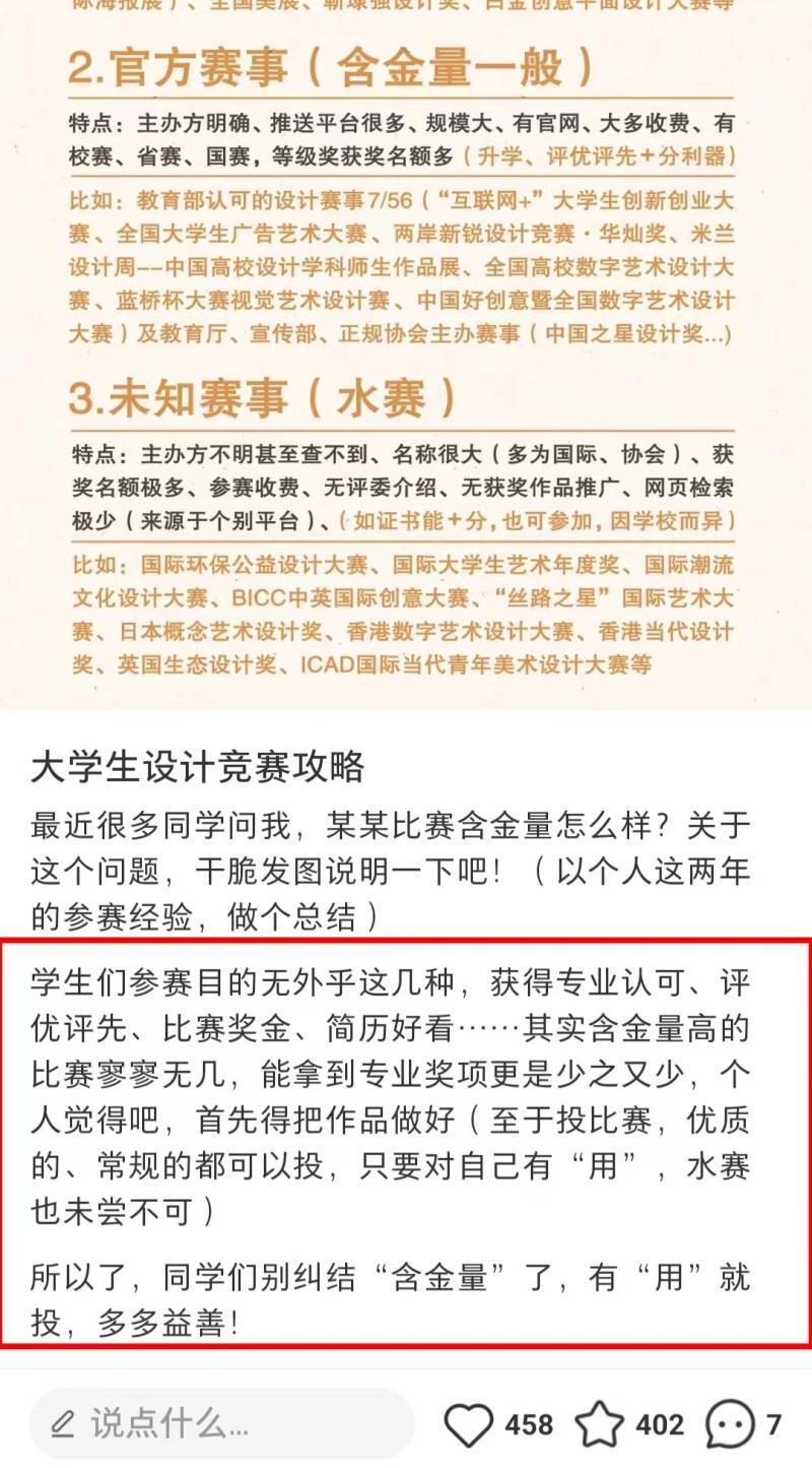 而在目录以外的很多竞赛,则被俗称为“水赛”。这类竞赛往往也有以下特征:主办方行政级别低、行业认可度低、获奖率高,有些比赛还需交参赛费等。