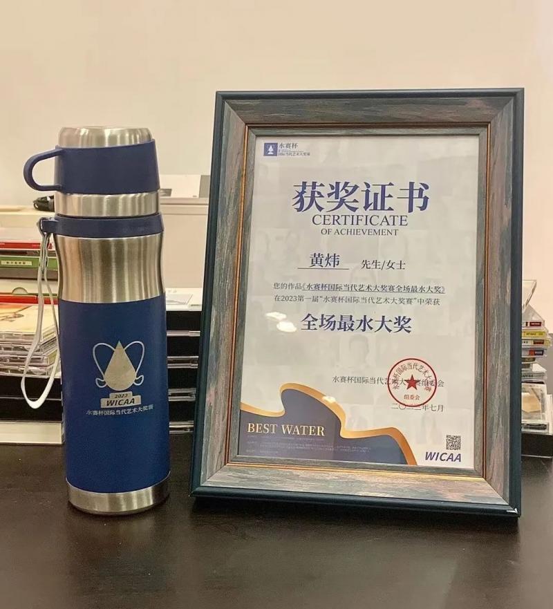 最终,全场最水大奖的得主黄炜(其实是陈高远的老师)拿到了定制水杯和获奖证书,陈高远还在纽约时代广场为其举办了一场15秒的个人投屏展览。