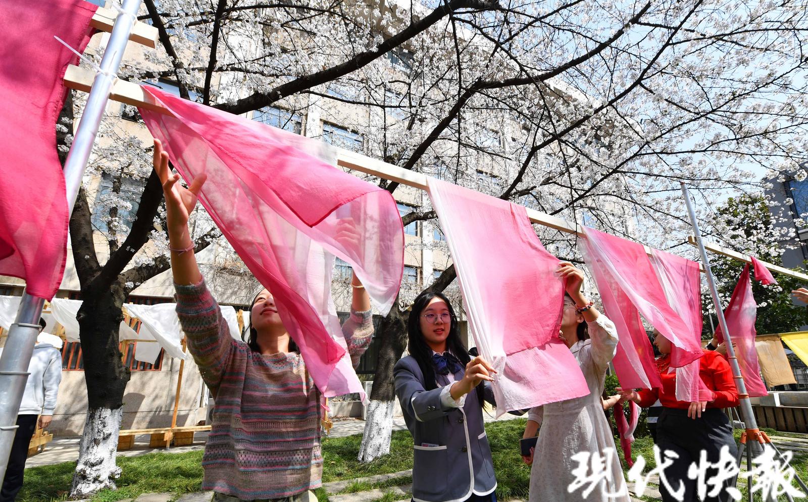 染制好的一条条丝巾,被同学们亲手系在樱花树下的艺术展架上,宛若复刻了樱花烂漫的春天。春风拂来,展架上片片樱花吹落如雨、缕缕丝巾随风舒展,同学们纷纷举起手机,记录下东大校园里的美妙时刻。