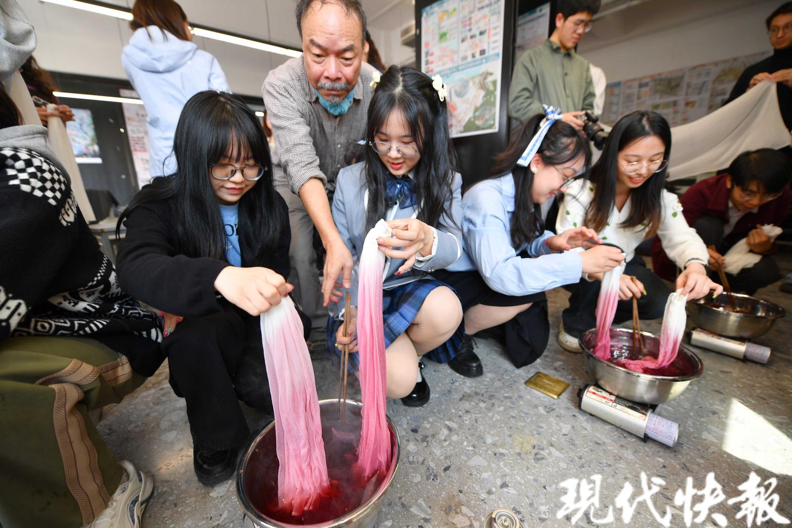 “正值草长莺飞、春风和煦的春天,校园里的樱花也开了。在东南大学最漂亮的教室里,学习制作中国扎染工艺,还知道了中国色彩的来源,是一次非常难得的体验。”建筑学院2022级本科生孙桥镒跟着老师一步步体验这项技术,粉红色的染料染出的丝巾,与窗外的樱花互为增色,格外美丽。