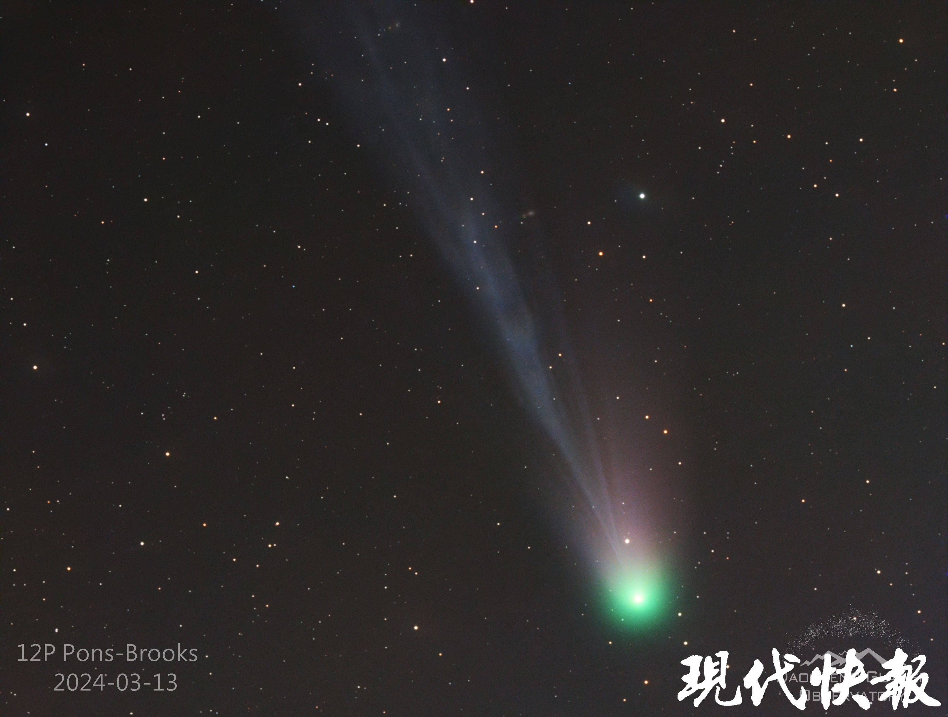 从今年3月起,庞斯-布鲁克斯彗星的亮度不断提升,但南京地区天气情况并不理想,达不到观测条件。姚慷并没有因此放弃这难逢的观测机会,而是将目光转向高海拔、晴朗少云的四川稻城。他通过远程天文望远镜,在太阳落山后成功捕捉到这颗彗星的踪迹,并为它拍下了靓照。