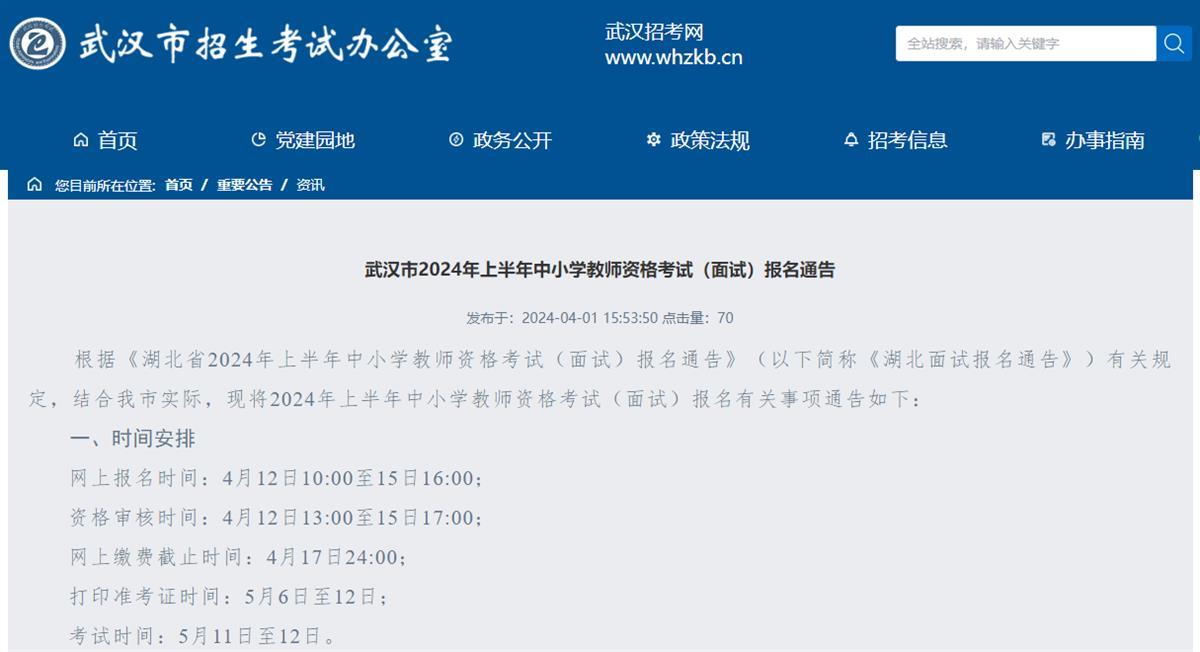 附:武汉市2024年上半年中小学教师资格考试(面试)报名通告