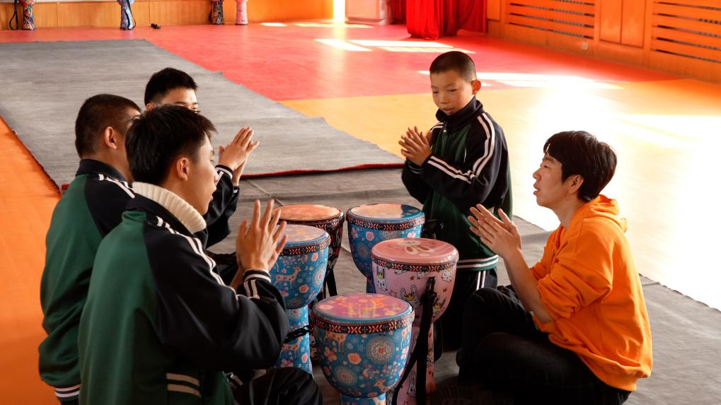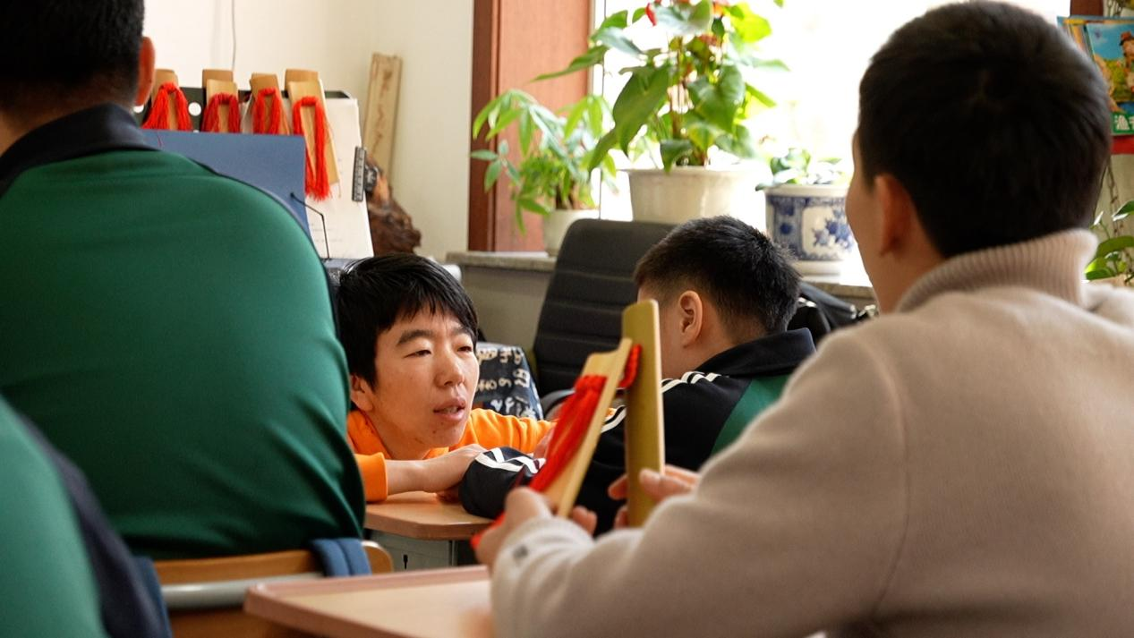 这是特殊教育学校的快板课堂。达达今年17岁,是班上的大小伙子了。七八岁刚来特殊学校的时候,每天哭闹不止,满地打滚,片刻不能安静。如今,他不仅快板打得不错,也能够和陌生人简单交流几句,表达自己的情感。“我要感谢李老师。”这是达达最想说的话。