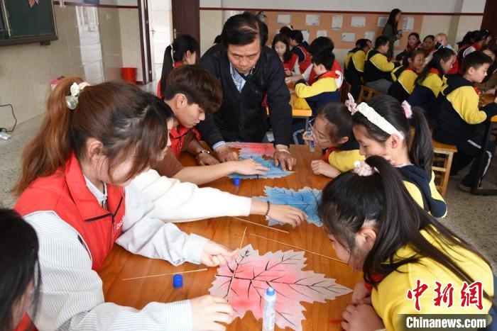 “把纸质枫叶沿着中缝对称折叠,然后将最上面的叶尖沿着梗线横向折叠……”北辰小学一间教室里,市级非遗项目“徐州风筝”代表性传承人曹开君现场教学生们制作风筝。来自江苏建筑职业技术学院的30余名大学生志愿者与北辰小学的30余名学生,结对协作,一起学习风筝制作。