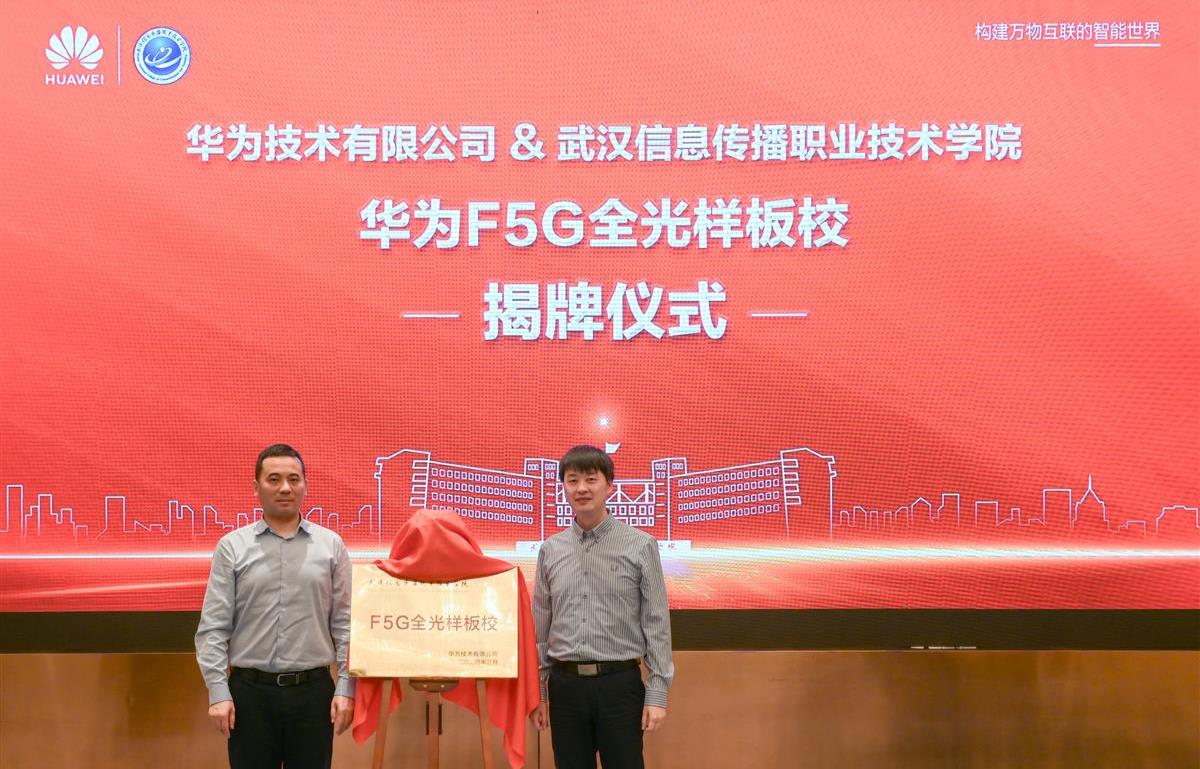 大会首先举行了隆重的授牌仪式。华为湖北代表处政企副总经理姚传磊与武汉信息传播职业技术学院副校长蔡明共同为“华为F5G全光样板校”揭牌,武汉信息传播职业技术学院正式成为华为F5G全光样板校。该项授牌标志着该校在第五代固定网络(全光无源网络)建设上走在了前列,在教育数字化转型工作方面向前迈出坚实一步。