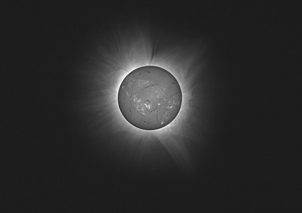 日冕可见光图像,可见大尺度日冕结构,中间日食区域为“羲和号”同时观测的色球图像