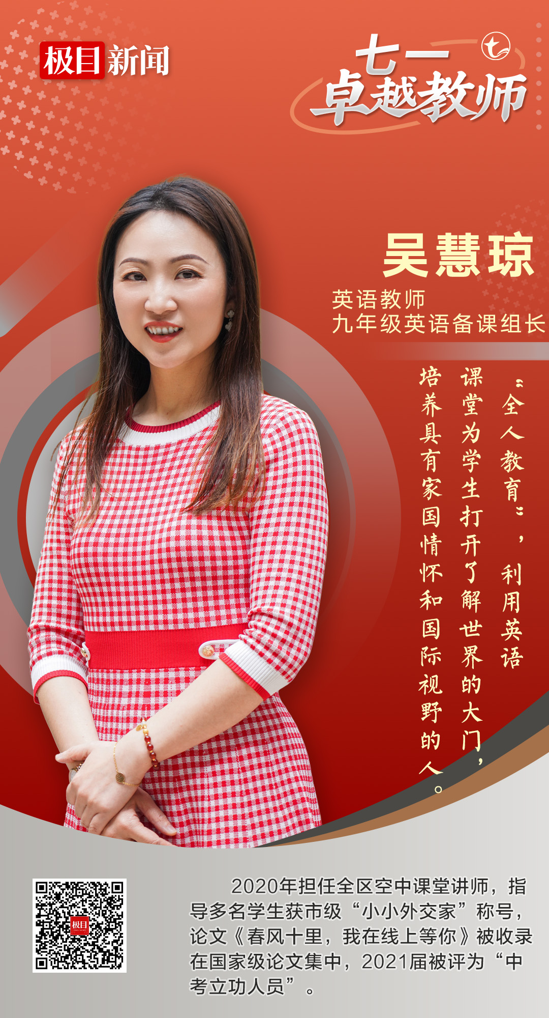 吴慧琼现为武汉市七一中学英语教师、九年级英语备课组组长。4月10日,回顾21年的育人之路,对学生抱有期待、相信学生、静待花开,是吴慧琼最大的体会。