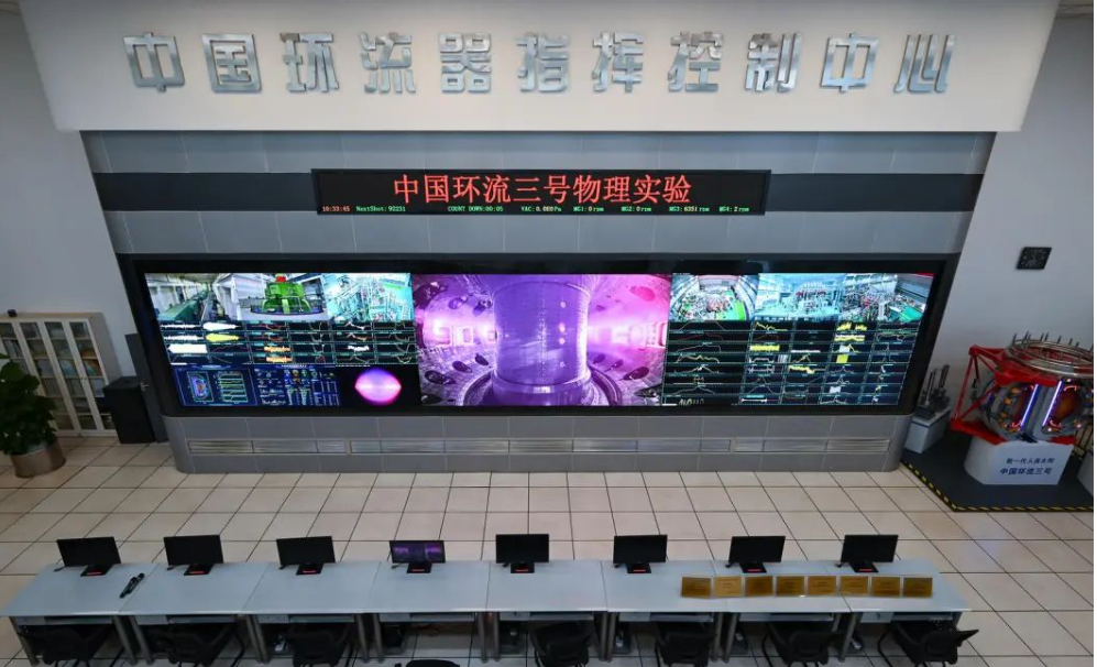 “中国环流三号”于2020年建成,总高8.39米,直径8米,等离子体离子温度可达1.5亿度,是中国目前规模最大、参数最高的先进托卡马克装置,也是国内新一代先进磁约束核聚变实验研究装置。