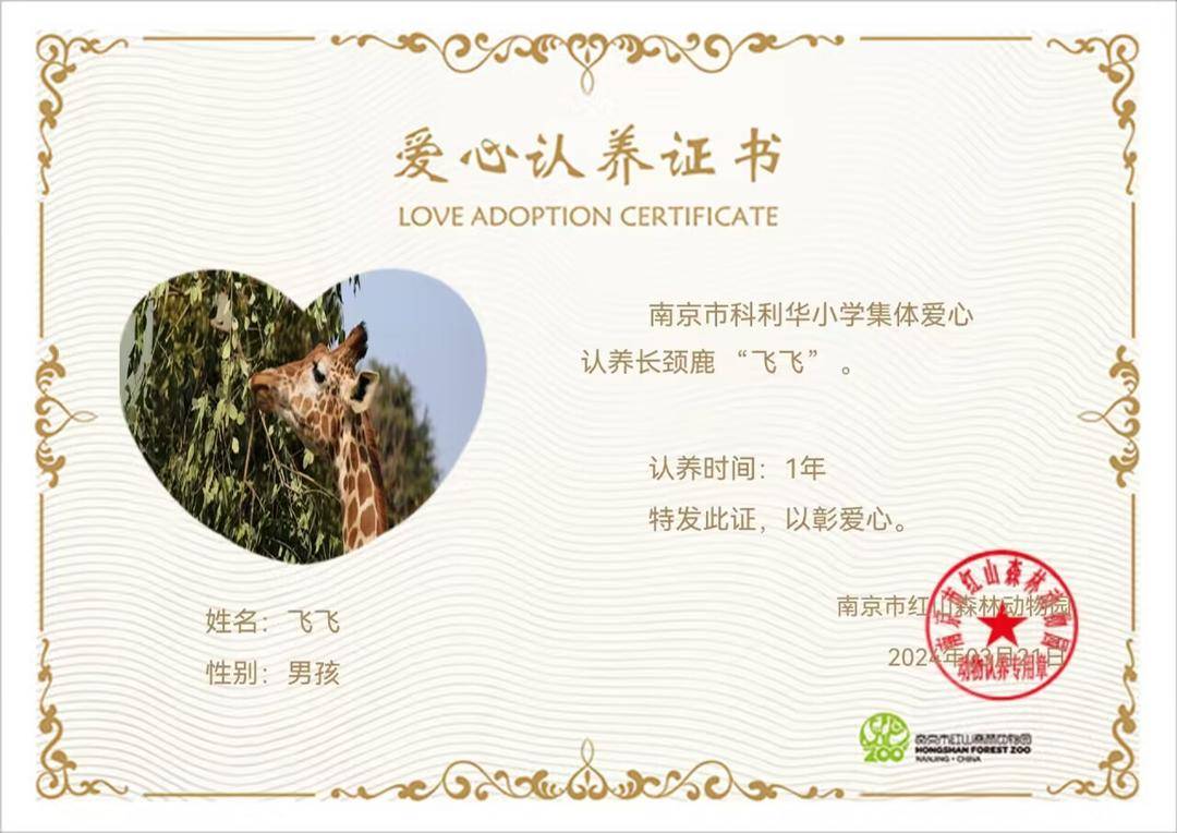 随后,他向参与认养仪式的学生代表授牌。南京市科利华小学大队长封亦歆表示,希望大家都能在此次活动中学习更多有关动物的知识,提升自己的责任感和观察力,多一些友爱、友善,加入到保护动物的行列中,让飞飞和所有的动物们都能开心地成长。