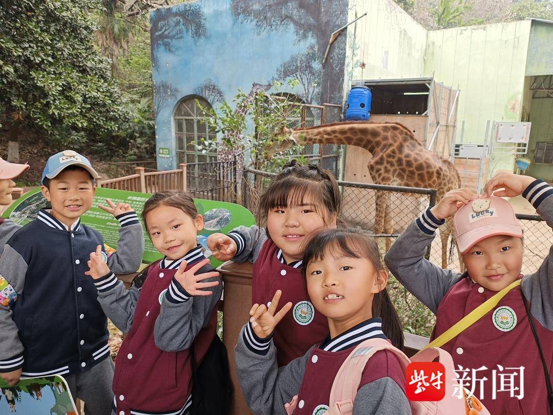 认养仪式结束后,孩子们终于见到了长颈鹿“飞飞”。他们向饲养员叔叔提出了很多还没有解决的困惑:“哪一只长颈鹿是飞飞,怎么认出他呀?长颈鹿平时玩什么?长颈鹿能活多少年?飞飞的家人都有谁?”饲养员叔叔和孩子介绍了长颈鹿的生活习性和特征,还告诉他们很多飞飞的小故事。同学们在老师的带领下结合研学单开展丰富多彩的研究活动,在大自然的教室中,感受生命力的蓬勃,增长知识与见识,提升能力与品质。
