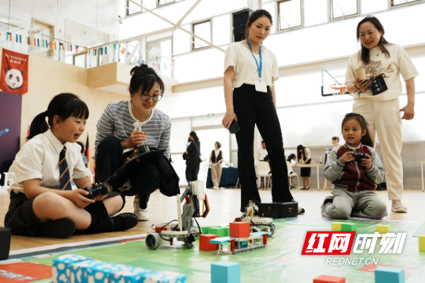 彼一米的孩子们在家长的陪伴下遥控机器人完成寻宝任务。