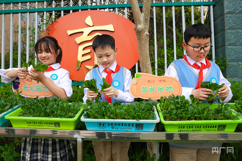 合肥市四河小学的孩子们在校园“蔬香乐园”采摘自己种植的蔬菜(央广网发合肥市庐阳区委宣传部供图)