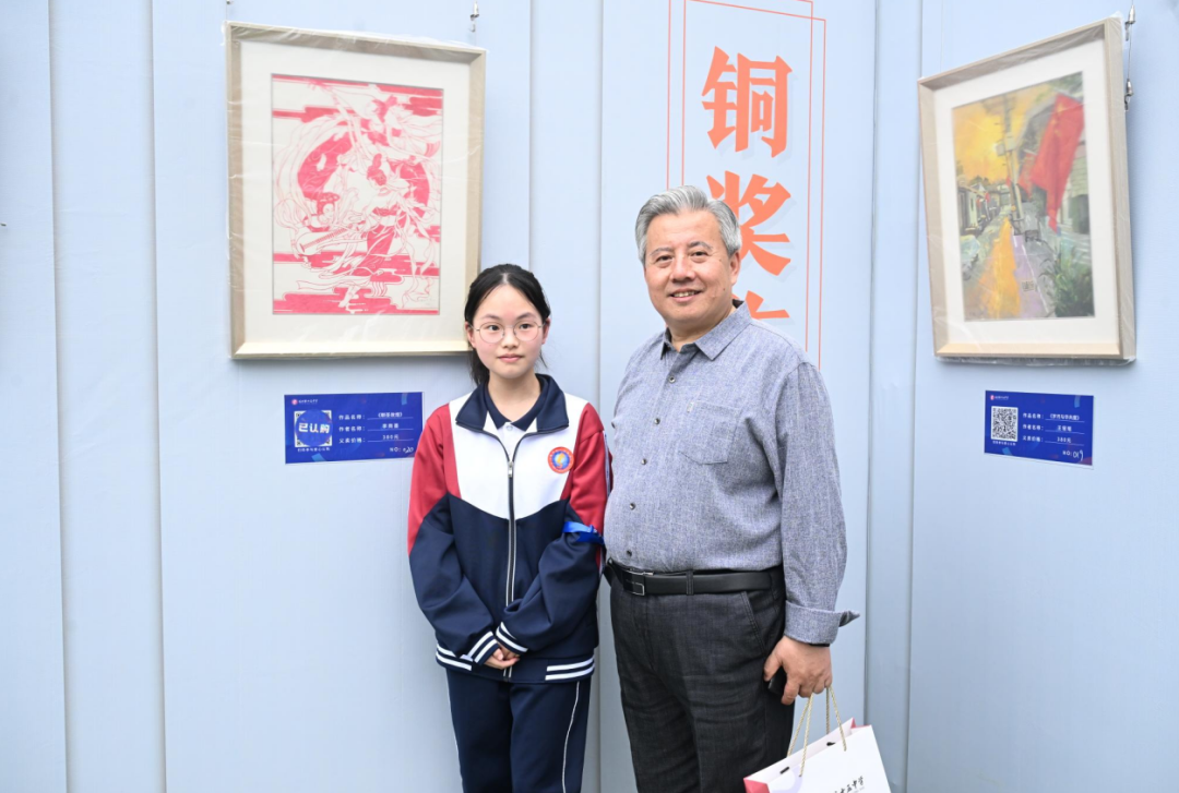中央美术学院附属实验学校姜源校长购买学生李雨墨获奖作品,并与作者合影。