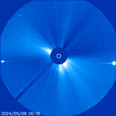 大耀斑爆发的同时,太阳活动区13664还伴随发生了日冕物质抛射。由于位于靠近可见日面中心的位置,从地球看去,喷发物形成一个圆面,也就是我们常提到的“全晕”。这类爆发活动喷出的太阳物质相对地球速度快、覆盖度高,高能物质命中地球的概率很高。
