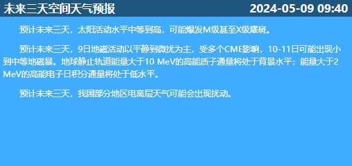 据了解,一次日冕物质抛射过程能将数以亿吨计的太阳物质高速抛离太阳表面,而且会携带着太阳强大的磁场能。一旦命中地球,会引发地磁场方向与大小的变化,即地磁暴。根据预警信息,5月10日至11日可能出现地磁活动,其中5月11日可能发生中等以上地磁暴,预计地磁活动将持续到11日甚至12日。
