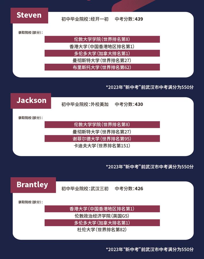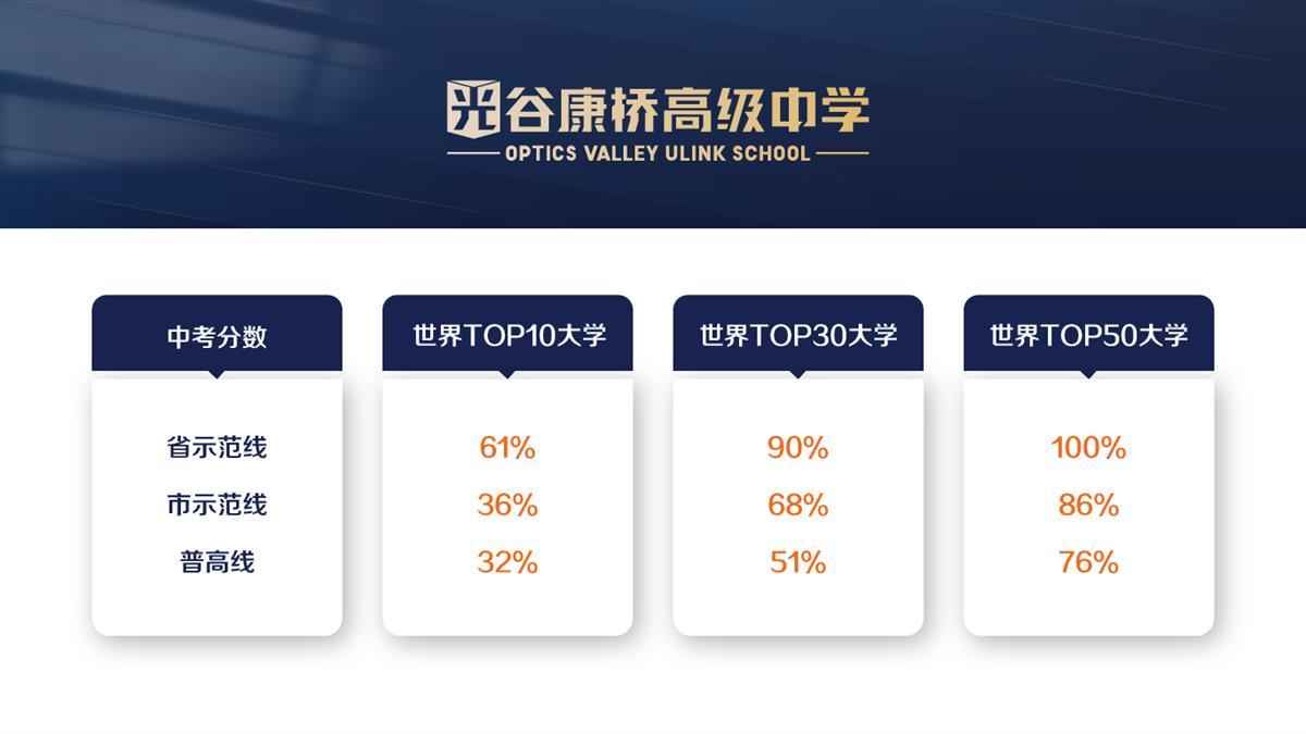 在光谷康桥2020-2023届毕业生中,入学时中考成绩处于省示范线及以上的学生,61%收获世界排名前10大学录取,90%收获世界排名前30大学录取,100%收获世界排名前50大学录取。