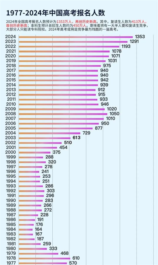 高考,作为无数学子实现梦想的重要阶梯,一直是普通家庭改变命运的普遍路径。自2017年以来,报名参加高考的人数持续攀升,到了2024年,考生总数已达到1353万,再创历史新高。
