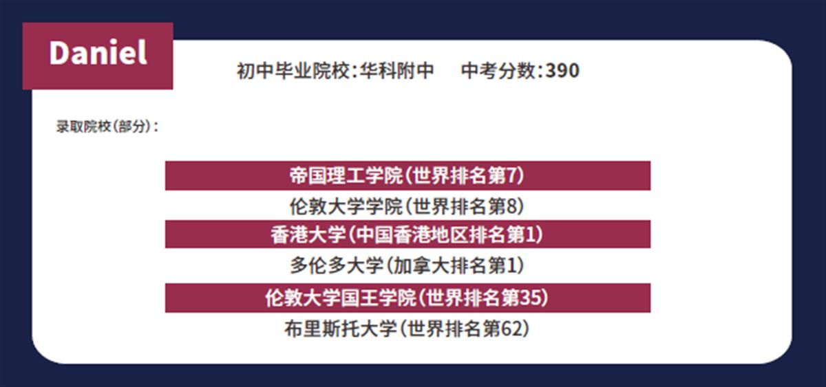 在回顾自己3年的高中生活后,Daniel不仅感慨道:“来到光谷剑(康)桥后,感觉最明显的就是学习并不是枯燥无味的,而是充满了乐趣,我并不那么惧怕和讨厌学习了,有信心能取得不错的成绩。”最终,他拿到了帝国理工学院生物医药专业录取。