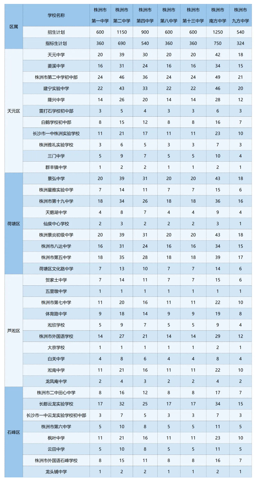 今年,城区普通高中招收指标生的学校共7所:株洲市第一中学、株洲市第二中学、株洲市第四中学、株洲市第八中学、株洲市第十三中学、株洲市南方中学、株洲市九方中学。
