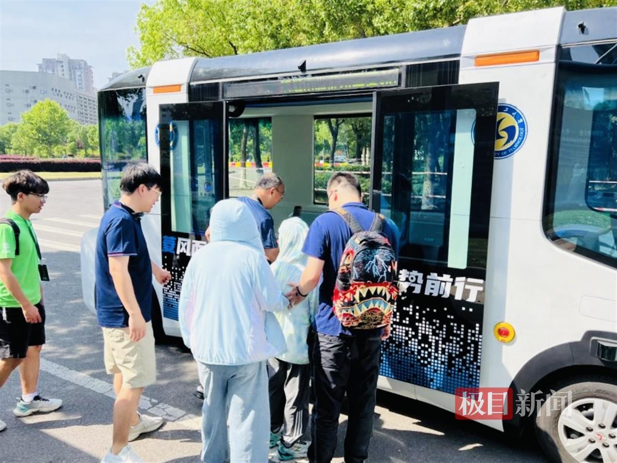 在南湖校区梅岭路,校友们坐上太空舱自动接驳车,体验无人驾驶智能车、欣赏校园风光。依托学校自动化、汽车、机电等学院,该车在五菱新能源线控底盘上,打造适用于景区、港口、园区等特定场景的L4级自动驾驶系统。