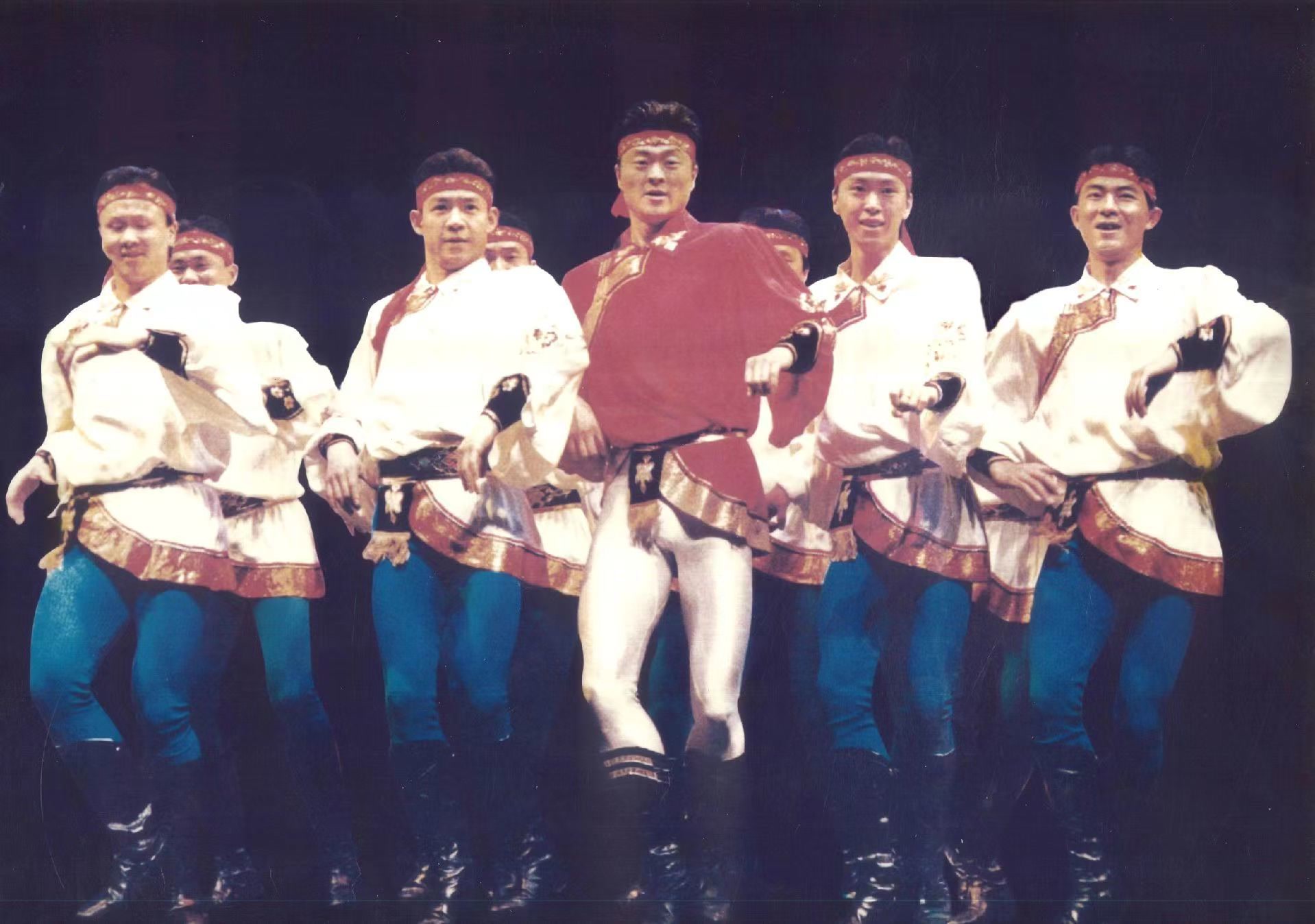 如今,气势磅礴、民族特色浓郁的《奔腾》已经成了中央民族大学舞蹈学院的保留节目之一。姜铁红曾担任第五代《奔腾》的领舞。网上可以找到一段略显模糊的视频,里面有他29岁时的身影——身材健硕,着红衣白裤,潇洒自如。