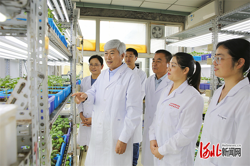5月20日,河北农大人工气候室,马峙英(左二)与团队成员查看棉花基因鉴定试验。赵凌云摄