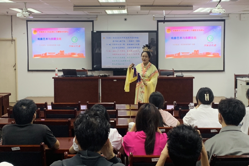 活动过程中还穿插了相关沉浸式体验环节。该校大学生艺术团兰韵戏曲社的同学为大家演唱黄梅戏《天仙配·四赞人间》选段,冯磊还分别演唱和播放了京剧《初出茅庐》选段、诗歌改编的越剧《四时田园杂兴》和《悯农》,现场同学穿上戏曲人物诸葛亮的戏服,学习简单的身段动作,赢得大家阵阵掌声。“艺术文化的发展不仅需要创新,更重要的是传承。江大学子在感知、传承戏曲文化的同时,也应该厚植知农爱农情怀,深耕沃土,把论文写在大地上。”冯磊寄语同学们。