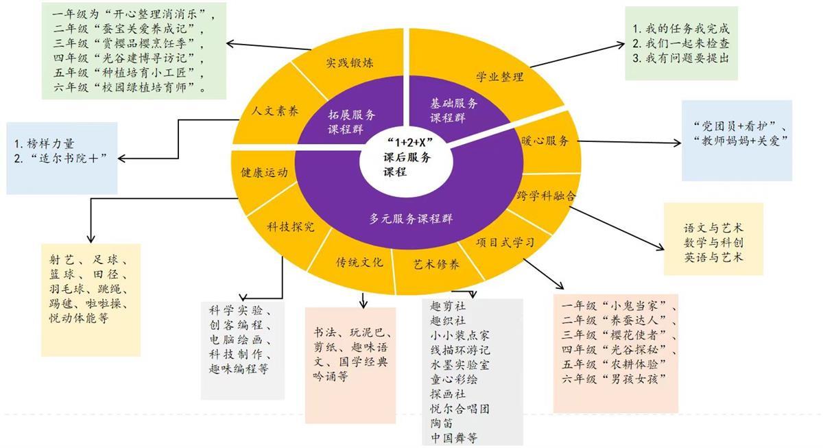 这正是该区选择推介光谷十二小课后服务经验的原因——一所投用仅6年的新学校,却通过细心对接家长需求建起了极为丰富的“1+2+X”课后服务课程体系,其中既有“不让一个孩子掉队”的学业整理课程(即“1”),又有各年级“劳动+”课程、阅读及榜样德育课程(即“2”)和艺体、科学、暖心服务等课程(即“X”)。“每项课程都源自学生的需要。像我们调研发现,很多学生家长因为孩子学习习惯不好而给他们在校外补习,学校就为全校学生在除周四(有社团活动)外都开设学业整理课程,指导学生整理学习心情、学习工具、当天学业内容,学会学习方法、学习策略等。暖心服务也是必不可少的,我们调研发现,有些学生父母很晚才能来接,便发动党团员教师轮班陪伴。”光谷十二小校长李伶说。