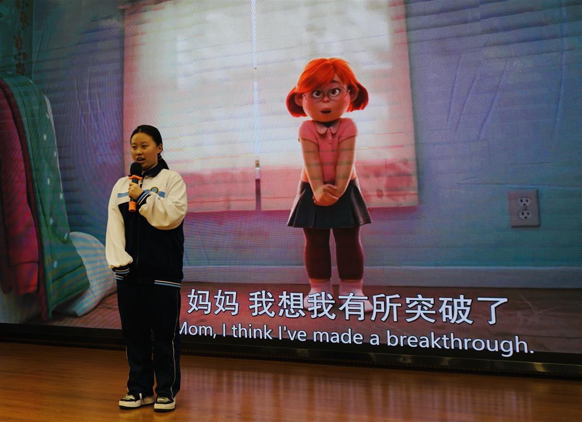 韩同学说的“演英语”是在英语知识抢答环节空档,同学们带来的丰富多彩的才艺演出。《星际穿越》《头脑特工队》《海洋奇缘》《彩虹小马》《至暗时刻》……有的班级,根据选定的精彩影片片段,通过自己的声音和演绎,将影片中人物情感诠释得淋漓尽致,不仅展现了自己的英语实力,更通过声音传达了角色的情感与灵魂。