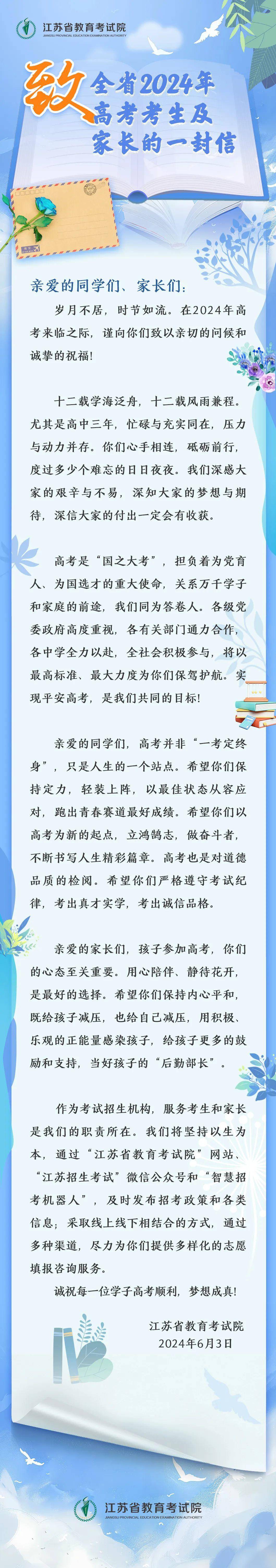 致江苏全省2024年高考考生及家长的一封信