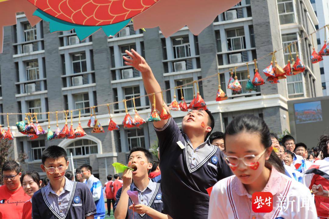 操场上,一座“鲤跃龙门”十分抢眼,龙门上悬挂着一只只彩色的粽子。毕业班的同学们挨个与任课老师击掌,跑向“龙门”,放飞承载梦想的纸飞机,既有“鱼跃龙门”,又有“高中”的寓意,仪式感满满。