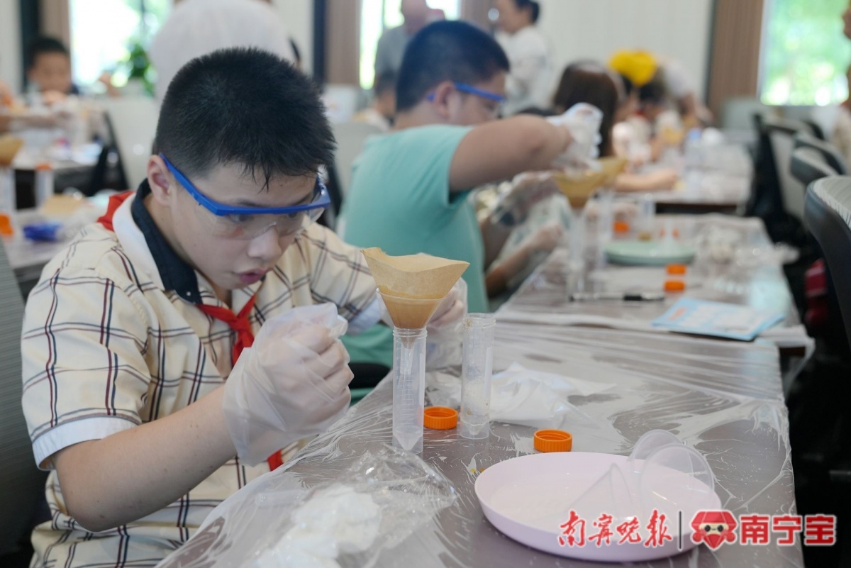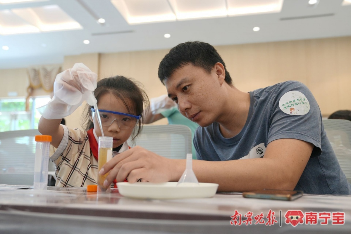 孩子们和家长一同体验垃圾渗滤液废水絮凝小实验。记者黄敬敏 摄