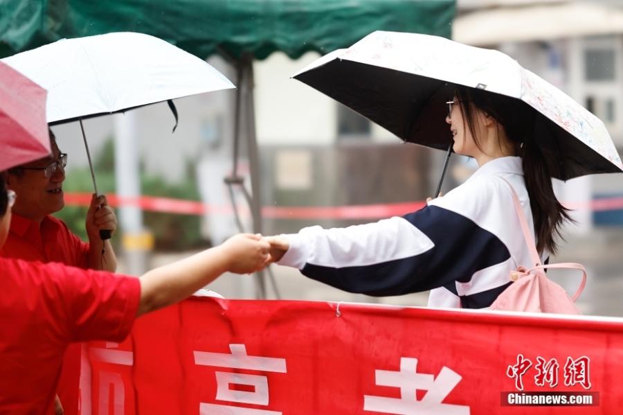 6月7日,北京市北京实验学校(海淀)考点,考生入场前与送考老师握手。当日,2024年全国高考拉开帷幕。 中新社 记者 盛佳鹏 摄