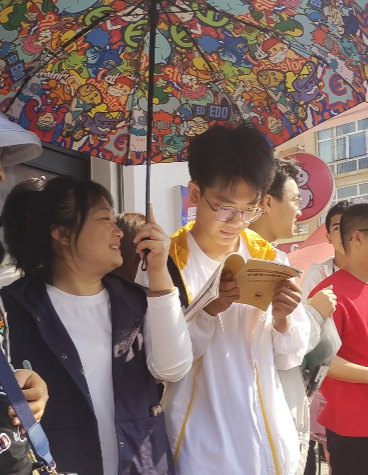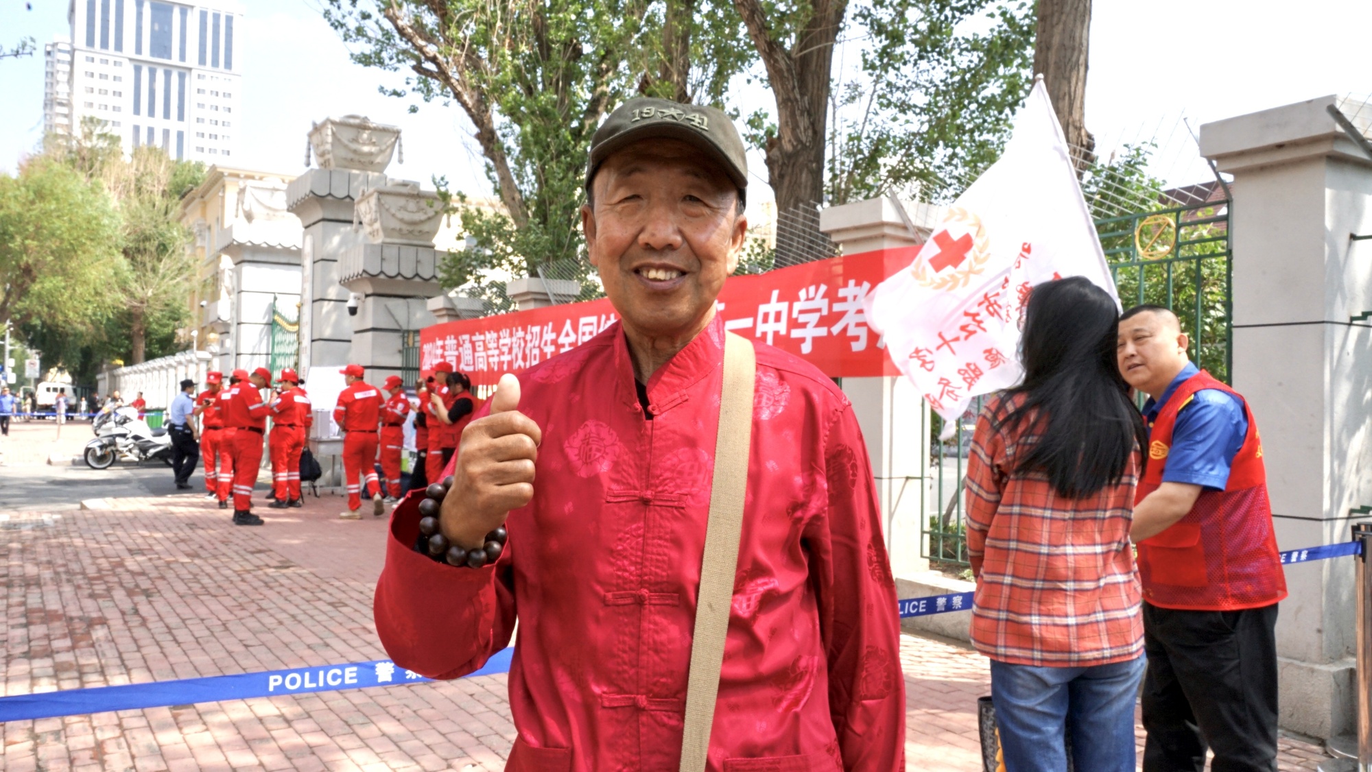 王先生的外孙子是一名高考生,早上6时半他就到考点为外孙助力:“我今天特意穿了一身红色,希望孩子能金榜题名。”