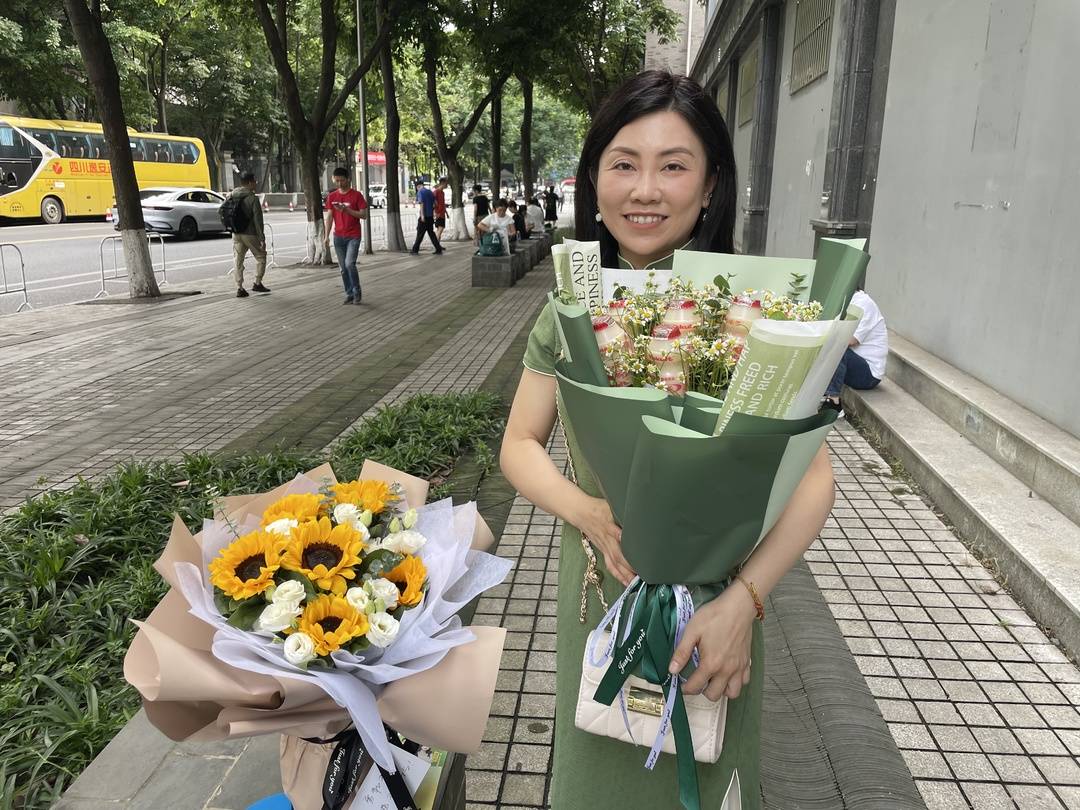 成都树德中学(宁夏校区)门口,一名女士准备的两捧花束很是引人注目,其中一束是向日葵,另一束则是养乐多。她解释说:“在很多人看来,高考完了也就是成年了,而养乐多一般都是小朋友喝的,我们就是希望她永远保持童真、快乐,即便成年了,还是可以继续喝养乐多。”
