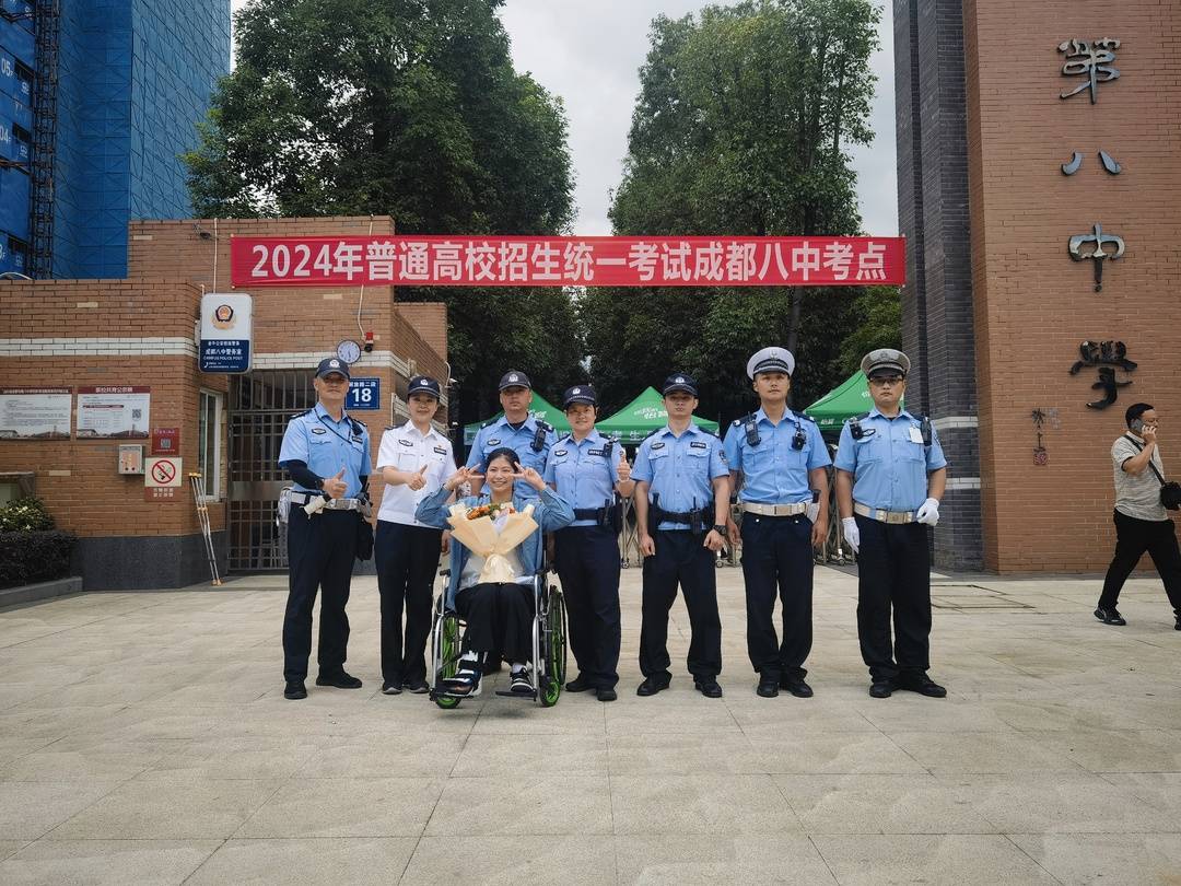 在这场热闹欢聚的氛围里,不乏温情一幕:在成都八中考点,坐着轮椅的考生小向专程向帮助她的警察表示感谢,并与他们合影留念。向爸爸告诉记者,整个高考期间,小向得到了很多人的照顾与帮忙,尽管都是很平凡的小事,但对于他们而言价值非凡。高考前夕,就读于成都七中万达学校的小向,不慎扭伤了脚,为了完成毕业前“最后一公里跑”的愿望,老师推着轮椅陪伴小向一起完成了最后一“跑”。小向还提到,就连食堂阿姨都会多打点菜,让她心里暖暖的。