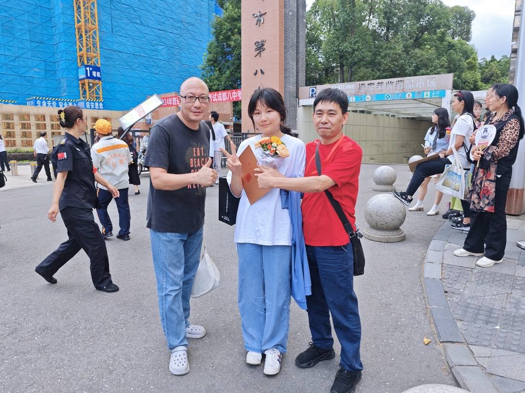 下午4点过,成都八中考点,尽管豆大的汗珠不断从脸上滑落,但6岁的田可欣(化名)不觉得累,因为还有一会儿,她就要见到考完后的哥哥啦。她的旁边还有爸爸、妈妈、表姐、表哥、姥姥、姥爷等一大家子人,他们特意赶来考点迎接哥哥田龙(化名)高考结束。记者在现场看到,每名家庭成员手持精心包装的鲜花,卡片上写满了对哥哥的寄语,“祝哥哥开心快乐!”妹妹亲笔写下的寄语,稚嫩、可爱。“985、211,不是问题!”姥姥的祝福率性、直接,更是对外孙实力的肯定。
