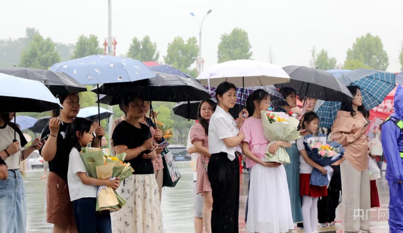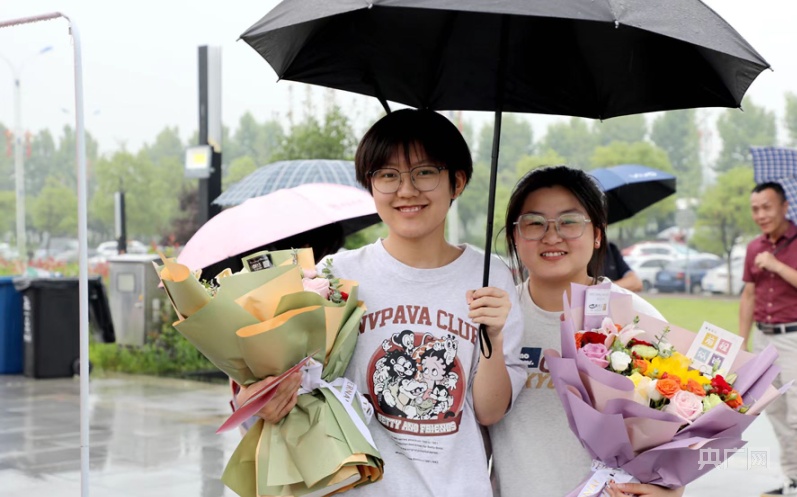 考生走出考场,接受家人朋友送上的鲜花和祝福(央广网发 陈梦林 摄)