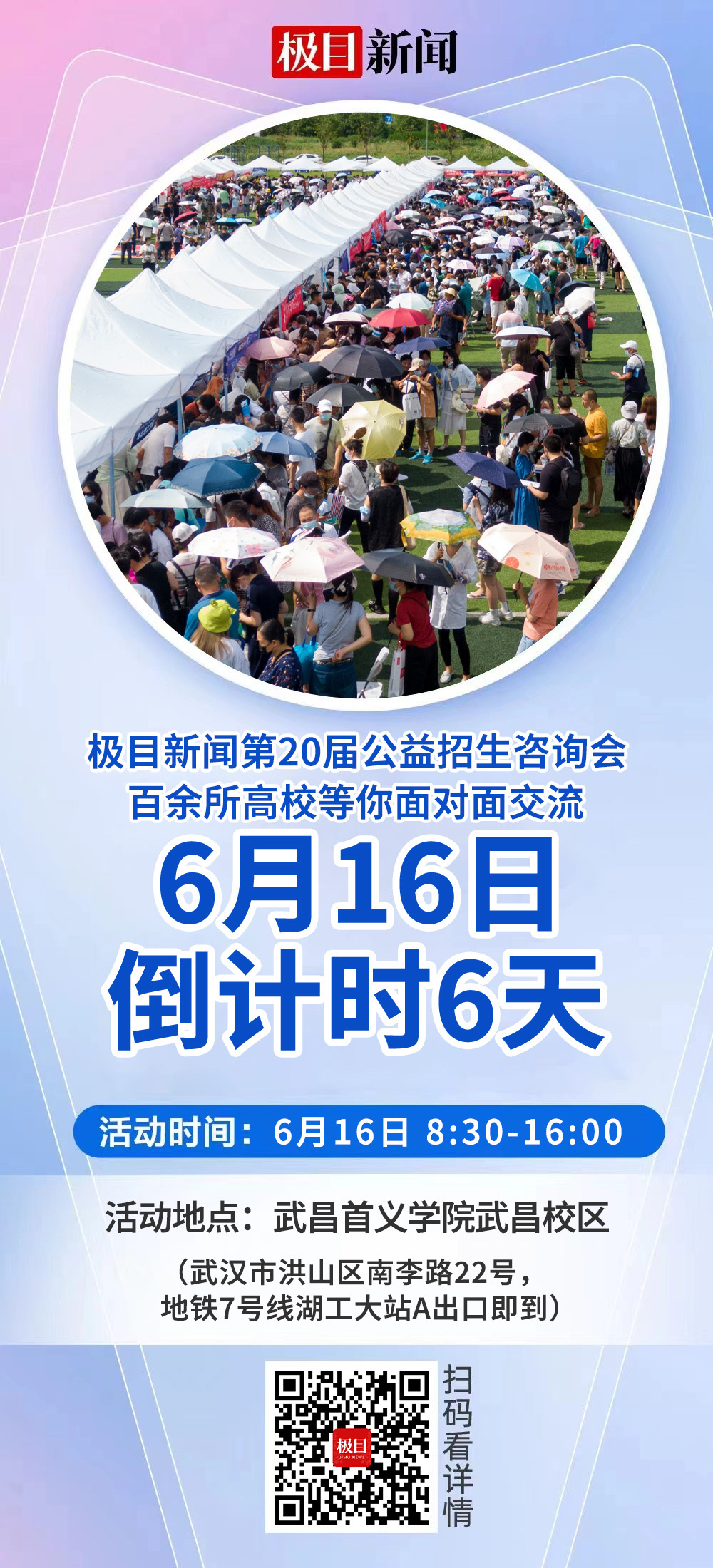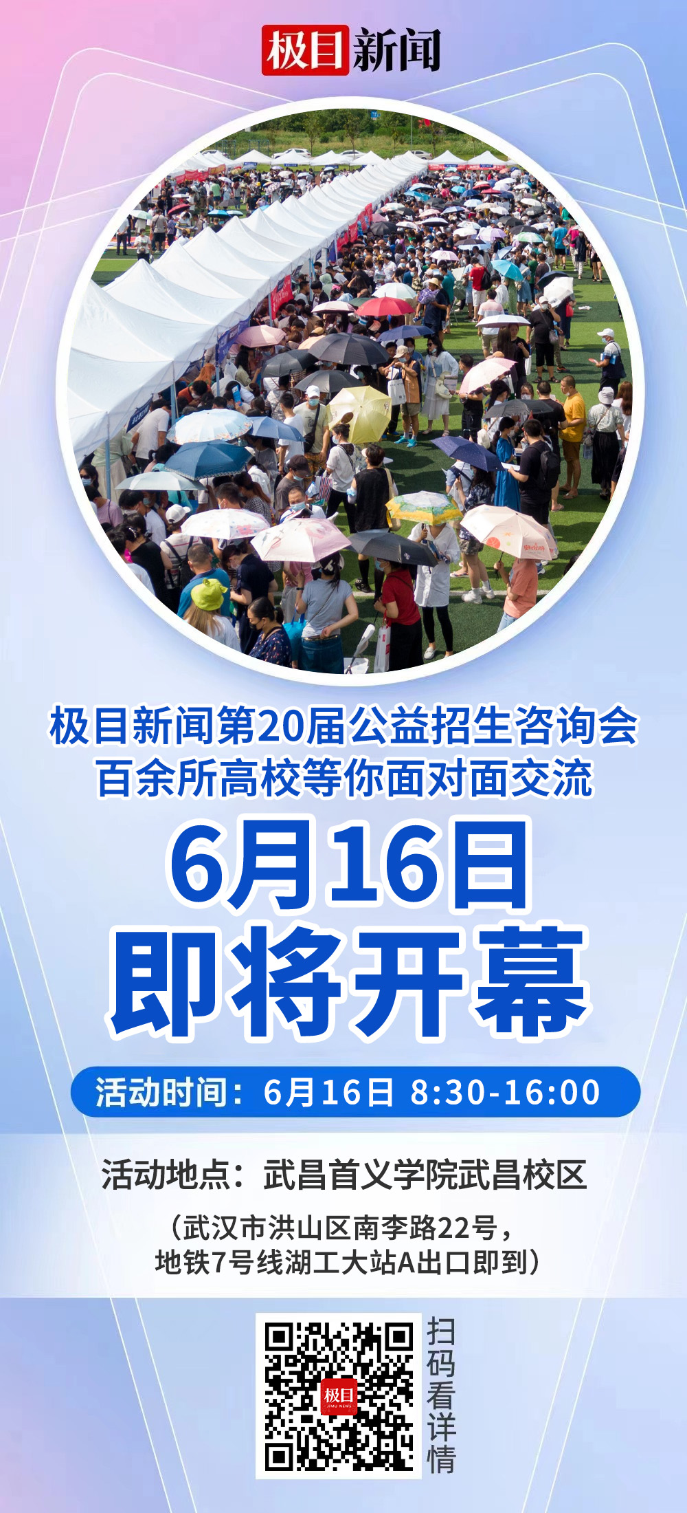 6月16日,极目新闻第二十届高校招生咨询会将于武昌首义学院武昌校区举行。届时,将有来自全国百余所高校、国际高教合作与留学机构的招生负责人一对一提供咨询,帮助考生和家长全面高效了解高校招生政策、专业设置、往年录取分数线以及各专业就业方向等相关问题,为考生和家长提供“一站式”咨询服务。