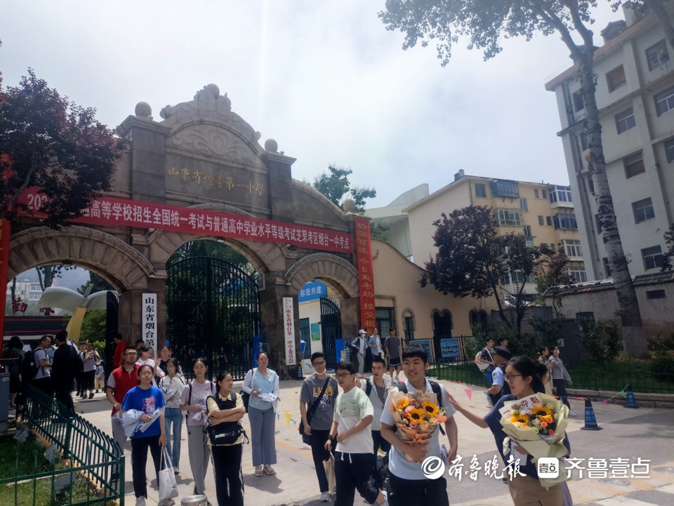 6月10日下午,烟台一中考点外,走出考点的考生手捧鲜花脸上洋溢着笑容