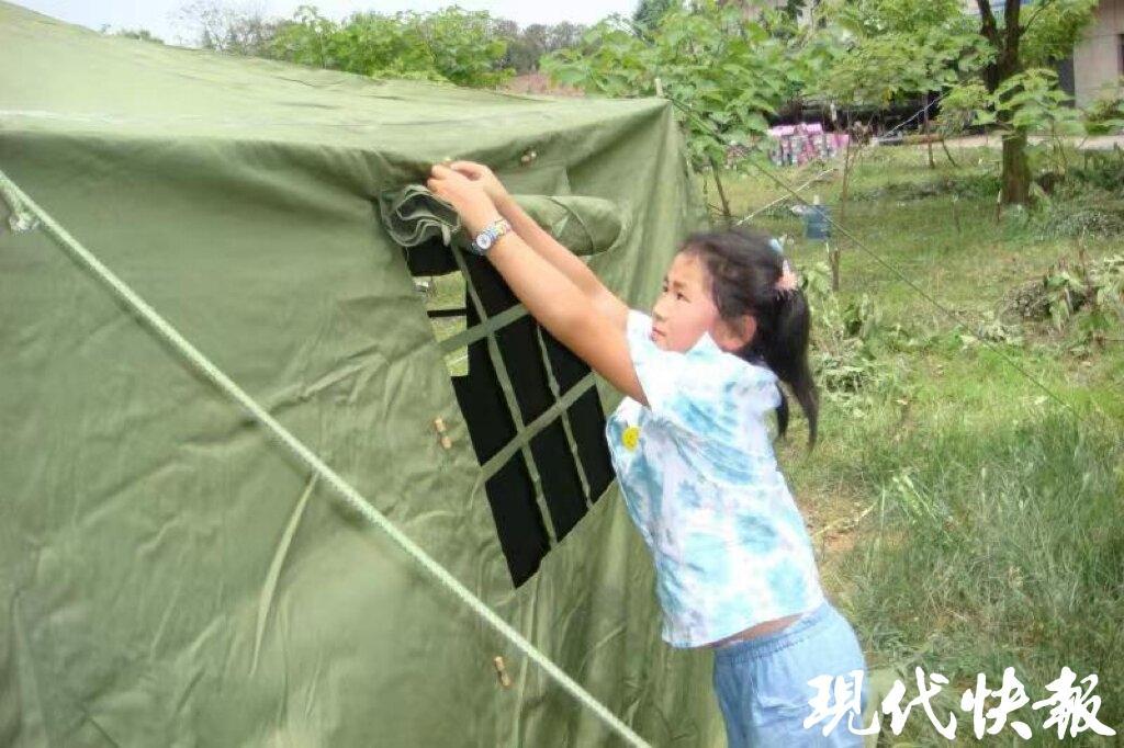 汶川地震后,8岁的梁采莹在整理帐篷