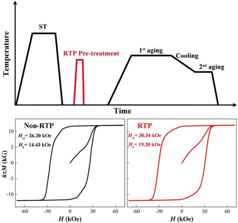 最近,马天宇教授团队发展了一种提高2:17型钐钴永磁材料矫顽力和膝点磁场的新方法。与传统的等温时效和慢冷处理工艺不同,马天宇教授团队在等温时效处理之前引入了额外的快速升降温(RTP)预处理,通过增多点缺陷和同时保持高密度线缺陷(位错),有效提高了对矫顽力起关键作用的1:5H析出相的形核率,同时加快了等温时效过程中结构缺陷的分解速度。