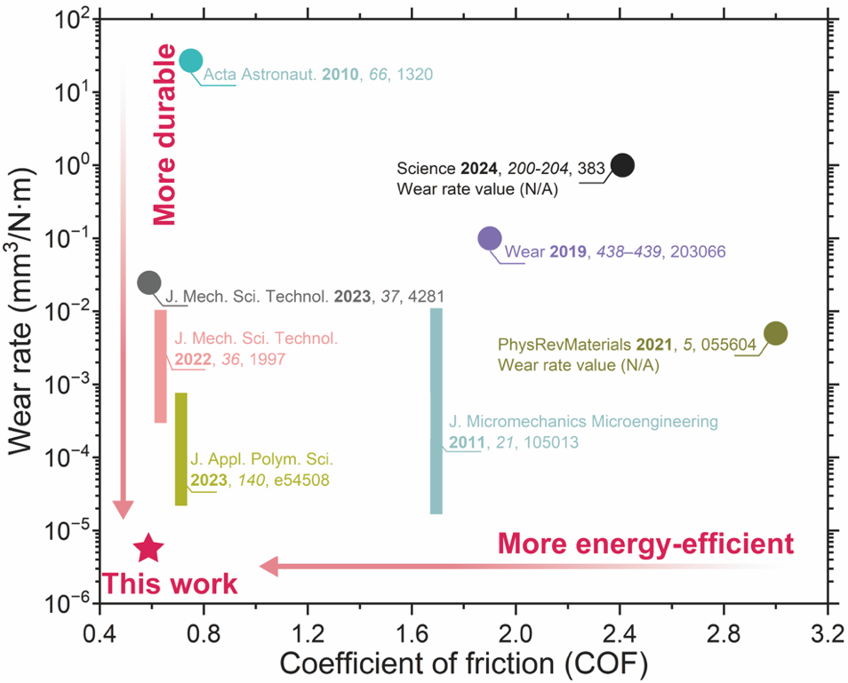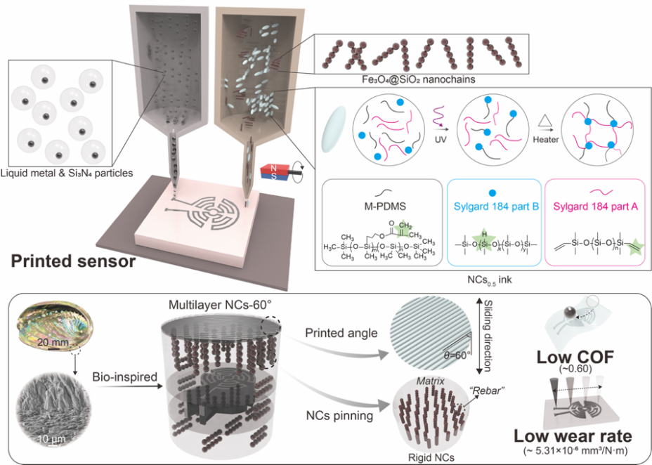 西安交通大学科研团队创新性地在打印体系内加入由磁诱导制备的二维纳米链条作为增强相,在不增加柔性基底刚度的同时,克服其摩擦系数高(本工作比纯聚二甲基硅氧烷降低了27.7%)及耐磨性差的难题。
