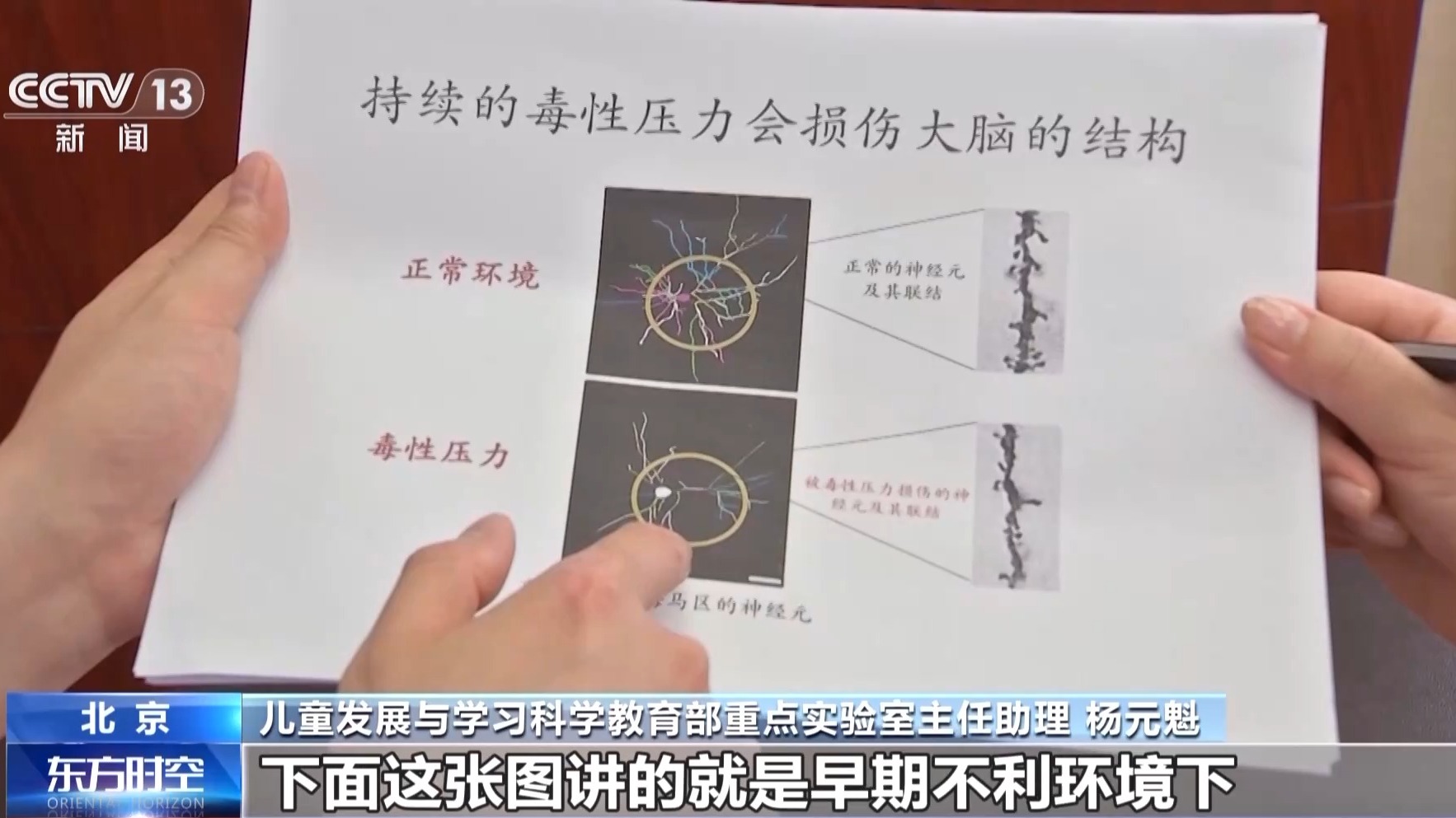 儿童发展与学习科学教育部重点实验室主任助理 杨元魁:上面这张图是正常环境下,神经细胞及其连接是比较丰富的,下面这张图讲的就是早期不利环境下,神经细胞还有突触的连接和发育就会受到影响,这就会导致脑发育可能迟缓,甚至是异常。所以如果早期的环境刺激不够丰富的话,那么对于孩子来说,他的灰质发育就会受到影响,就会影响孩子将来的学习、记忆等等。