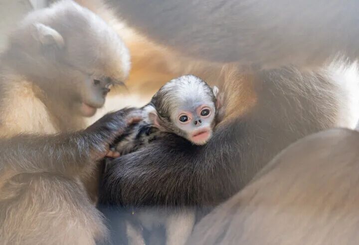 2024年3月28日,在贵州梵净山国家级自然保护区黔金丝猴研究中心拍摄的黔金丝猴小宝宝。李鹤 摄