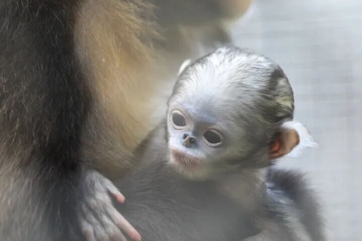 2024年4月2日在贵州梵净山国家级自然保护区管理局野生动物救护中心(黔金丝猴研究中心) 拍摄的黔金丝猴小宝宝。叶顺强 摄