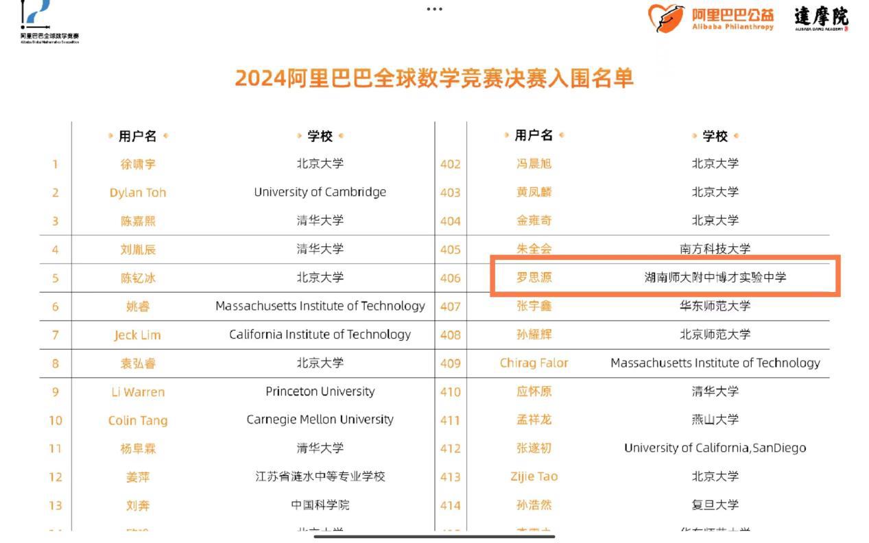 更让人赞叹的是,2023年12月,还是初三的罗思源通过清华大学的考察,成功入选清华大学丘成桐数学科学领军人才培养计划第一批名单,获得保送清华大学求真书院的资格。2024年6月成功晋级2024年阿里巴巴全球数学竞赛决赛。目前罗思源在清华大学学习。