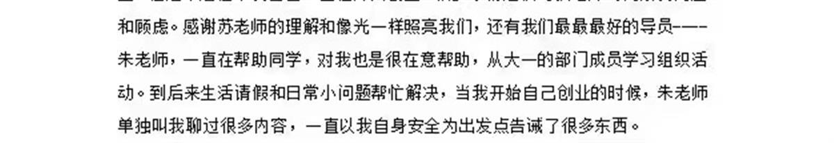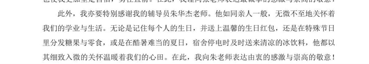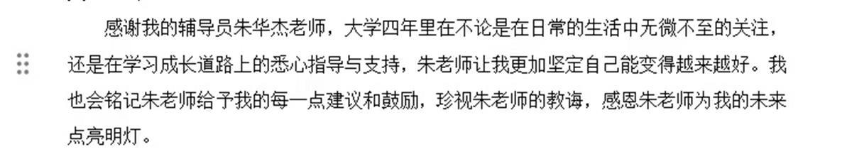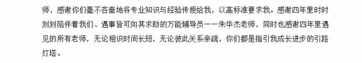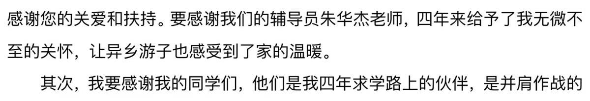 这位“朱妈妈”是陪伴了他们四年的两位辅导员之一,朱华杰老师。论文评委老师将这一现象发到了自己的朋友圈后,引发多位评委的共鸣,“我这里几乎每篇致谢都有朱老师,可以开出个专栏了”“致谢感谢导师是常规,感谢辅导员是超纲,真情流露。”