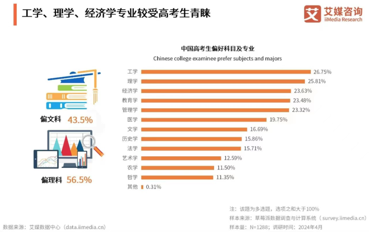 艾媒咨询日前发布的《2024年中国高考志愿填报及就业前景大数据分析报告》显示,49.14%中国高考生意向城市为一线或新一线;所学科目较偏理科(56.5%),其偏好专业有工学、理学、经济学、教育学、管理学,分别占比26.75%、25.81%、23.63%、23.48%、23.32%。